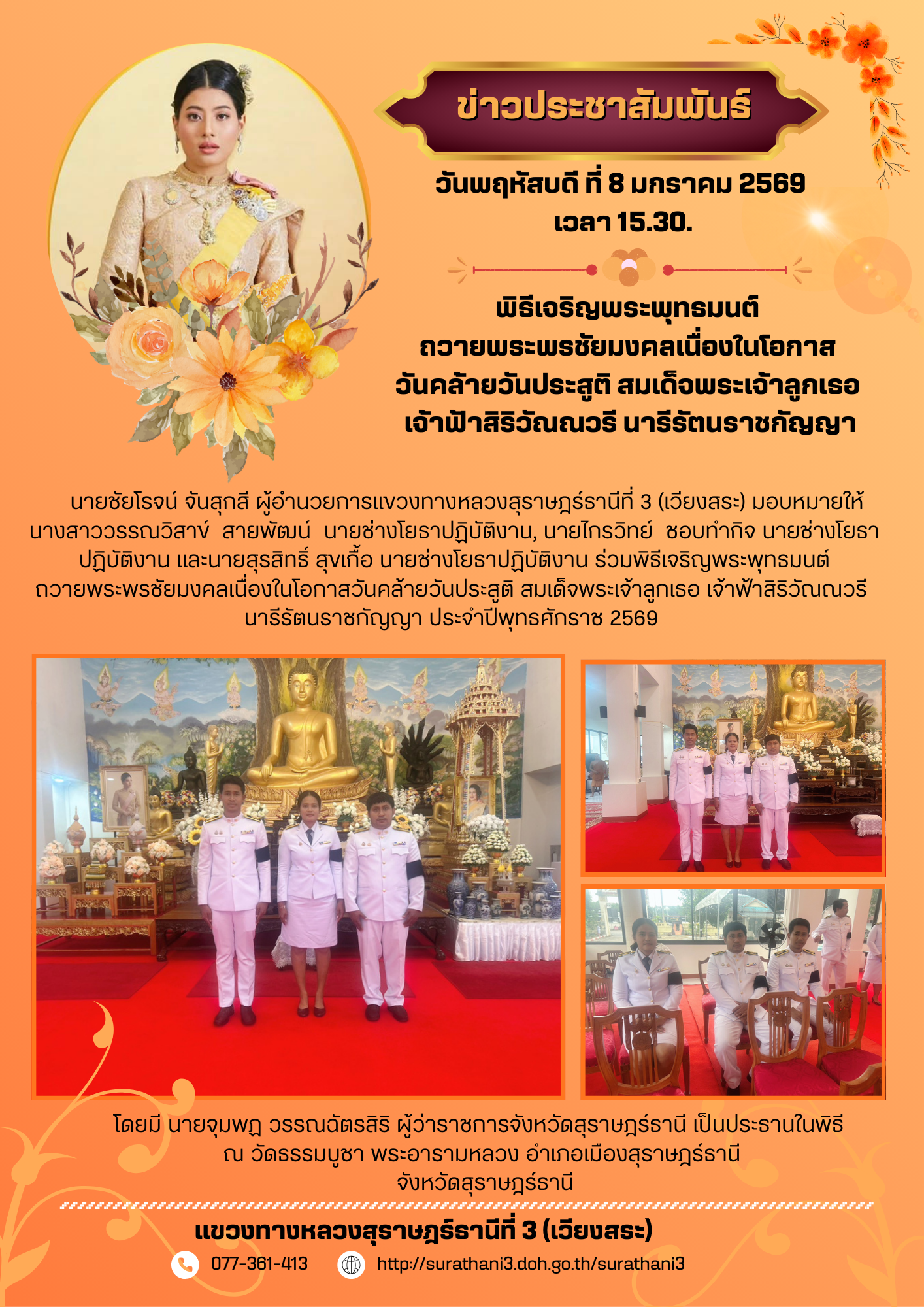 วันพฤหัสบดี ที่ 8 มกราคม 2569 เวลา 15.30 น.นายชัยโรจน์ จันสุกสี ผู้อำนวยการแขวงทางหลวงสุราษฎร์ธานีที่ 3 (เวียงสระ) มอบหมายให้ นางสาววรรณวิสาข์ สายพัฒน์ นายช่างโยธาปฏิบัติงาน, นายไกรวิทย์ ชอบทำกิจ นายช่างโยธาปฏิบัติงาน และนายสุรสิทธิ์ สุขเกื้อ นายช่างโยธาปฏิบัติงาน ร่วมพิธีเจริญพระพุทธมนต์ถวายพระพรชัยมงคลเนื่องในโอกาสวันคล้ายวันประสูติ สมเด็จพระเจ้าลูกเธอ เจ้าฟ้าสิริวัณณวรี นารีรัตนราชกัญญา ประจำปีพุทธศักราช 2569 โดยมี นายจุมพฏ วรรณฉัตรสิริ ผู้ว่าราชการจังหวัดสุราษฎร์ธานี เป็นประธานในพิธี ณ วัดธรรมบูชา พระอารามหลวง อำเภอเมืองสุราษฎร์ธานี จังหวัดสุราษฎร์ธานี