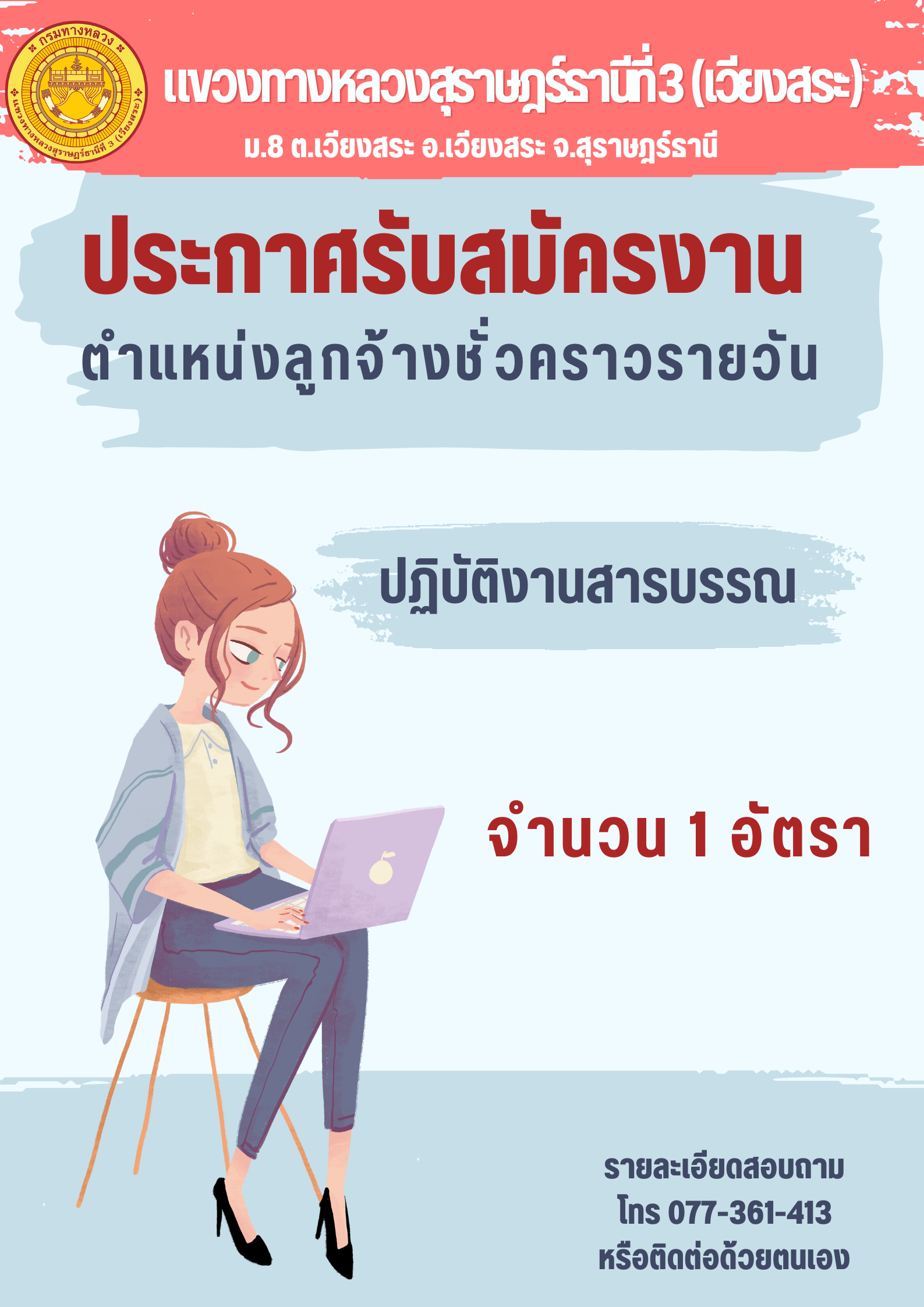 แขวงทางหลวงสุราษฎร์ธานีที่ 3 (เวียงสระ) ประกาศรับสมัครงาน ตำแหน่งลูกจ้างชั่วคราวรายวัน จำนวน 1 อัตรา (ปฏิบัติงานสารบรรณ) รายละเอียดสอบถาม โทร. 077-361413 หรือติดต่อด้วยตนเอง