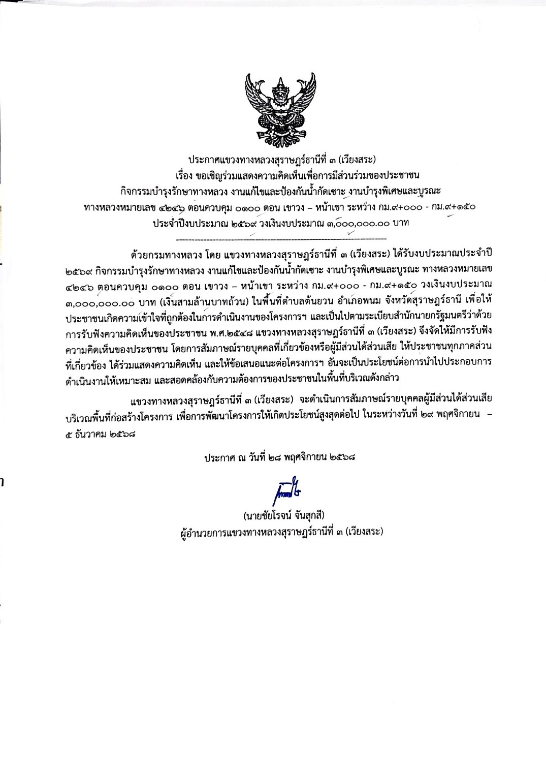 แขวงทางหลวงสุราษฎร์ธานีที่ 3 (เวียงสระ) โดย นายชัยโรจน์ จันสุกสี ตำแหน่ง ผู้อำนวยการแขวงทางหลวงสุราษฎร์ธานีที่ 3 (เวียงสระ) จะดำเนินการรับฟังความคิดเห็นของประชาชน ในการดำเนินการกิจกรรมบำรุงรักษาทางหลวงงานแก้ไขและป้องกันน้ำกัดเซาะงานบำรุงพิเศษและบูรณะทางหลวงหมายเลข 4246 ตอนควบคุม 0100 ตอน เขาวง - หน้าเขาระหว่าง กม.9+000 - กม.9+150 วงเงินงบประมาณ 3,000,000.00 บาท แขวงทางหลวงสุราษฎร์ธานีที่ 3 (เวียงสระ) จะดำเนินการสัมภาษณ์รายบุคคลผู้มีส่วนได้ส่วนเสียบริเวณพื้นที่ก่อสร้างโครงการ เพื่อการพัฒนาโครงการให้เกิดประโยชน์สูงสุดต่อไป ในวันที 29 พฤศจิกายน - 5 ธันวาคม 2568