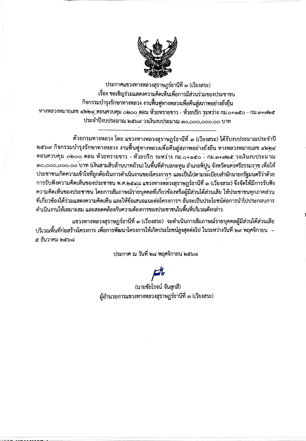 แขวงทางหลวงสุราษฎร์ธานีที่ 3 (เวียงสระ) โดย นายชัยโรจน์ จันสุกสี ตำแหน่ง ผู้อำนวยการแขวงทางหลวงสุราษฎร์ธานีที่ 3 (เวียงสระ) จะดำเนินการรับฟังความคิดเห็นของประชาชน ในการดำเนินการกิจกรรมบำรุงรักษาทางหลวง งานฟื้นฟูทางหลวงเพื่อคืนสู่สภาพอย่างยั่งยืน ทางหลวงหมายเลข 4224 ตอนควบคุม 0200 ตอน ห้วยทรายขาว - ห้วยปริก ระหว่าง กม.0+150 - กม.3+725 วงเงินงบประมาณ 30,000,000.00 บาท แขวงทางหลวงสุราษฎร์ธานีที่ 3 (เวียงสระ) จะดำเนินการสัมภาษณ์รายบุคคลผู้มีส่วนได้ส่วนเสียบริเวณพื้นที่ก่อสร้างโครงการ เพื่อการพัฒนาโครงการให้เกิดประโยชน์สูงสุดต่อไป ในวันที 29 พฤศจิกายน - 5 ธันวาคม 2568